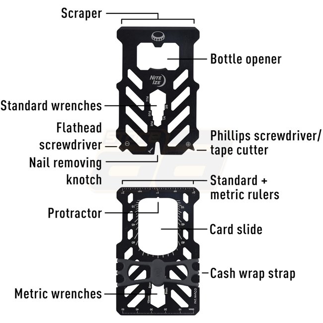 • Enthält: Cash Wrap Strap, Flaschenöffner, 5 Schraubenschlüssel in Standardgröße, 6 Schraubenschlüssel in metrischer Größe, Kerbe zum Nagelziehen, Kreuzschlitzschraubendreher, Schlitzschraubendreher, Schaber, metrische und Standardlineale und Winkelmesser