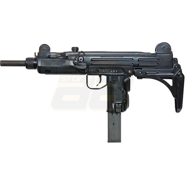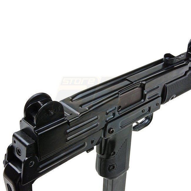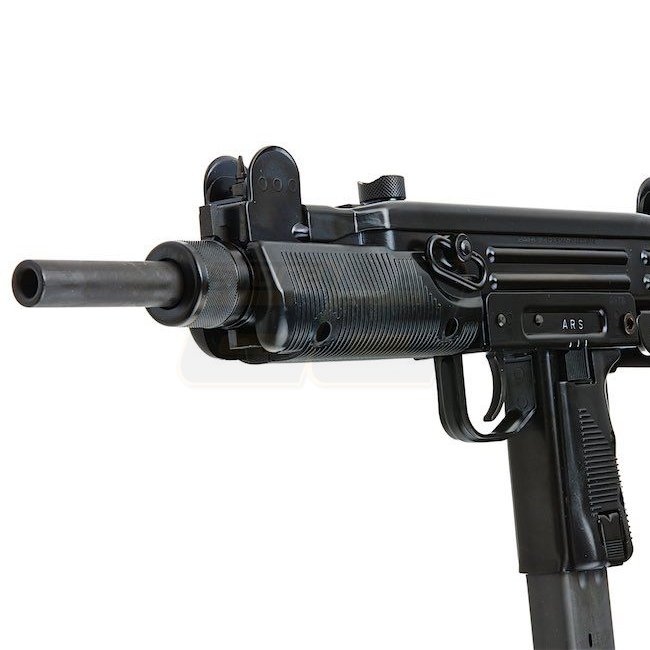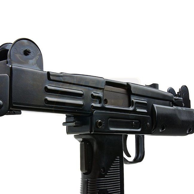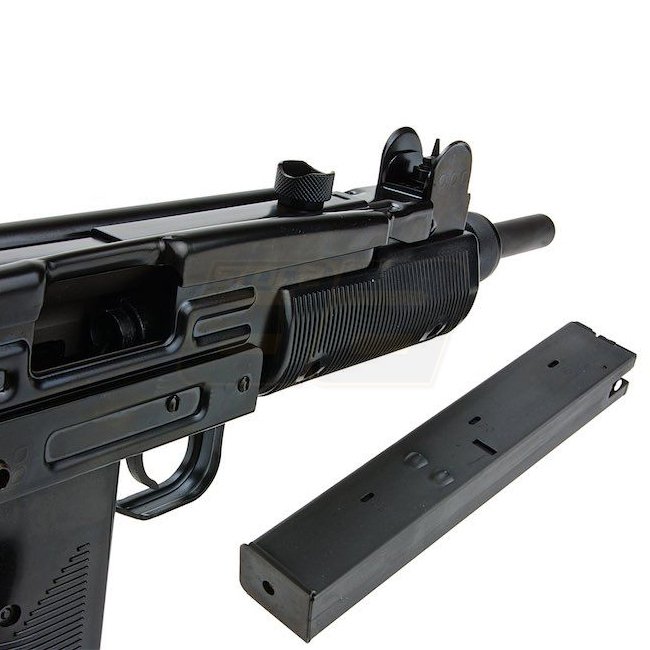 Northeast UZI VN Gas Blow Back SMG - hochwertige Stahl-Airsoft-Waffe mit 32-Schuss-Magazin, 470 / 640mm Länge, 3190g Gewicht, 175mm Innenlauf. Schießt mit 330-350 FPS im Halbautomatik- und Vollautomatikmodus und hat eine Reichweite von 45,27-48,02m. Verst