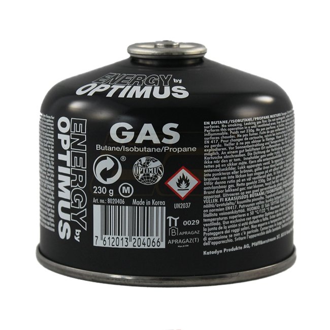 Optimus Gas 230g Butan/Isobutan/Propan. Premium-Mischung für optimale Kochleistung. Intelligente Dichtung schützt die Dose. Die 230g Größe eignet sich ideal für Outdoor-Abenteuer.