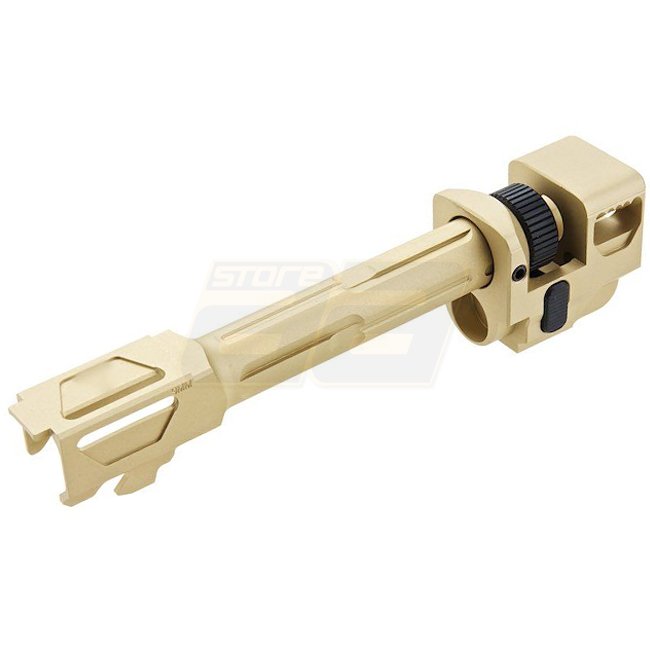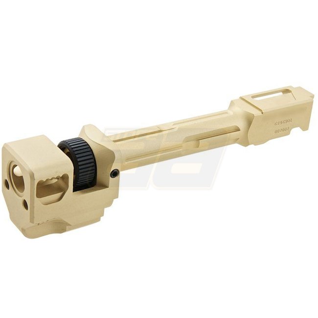 Upgrade deine Glock mit diesem stylischen, gedrehten Außengehäuse und Kompensator in Gold! Hergestellt aus leichtem Aluminium, wiegt nur 70 g und hat eine Länge von 135 mm. Perfekt für Gen4, G19x und G45 Modelle von VFC.