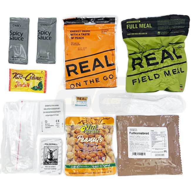 Inhalt: Hauptgericht, Löffel sowie variierende Beilagen (z.B. Kaffee, Energy Drink, Sauce etc.). 5443 kJ / 1300 kcal pro Portion.