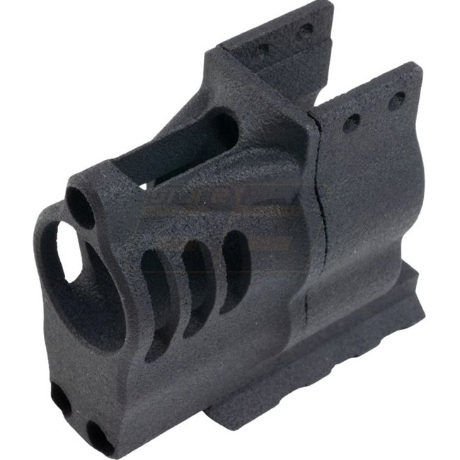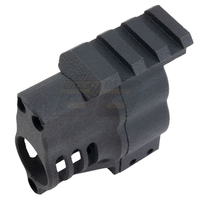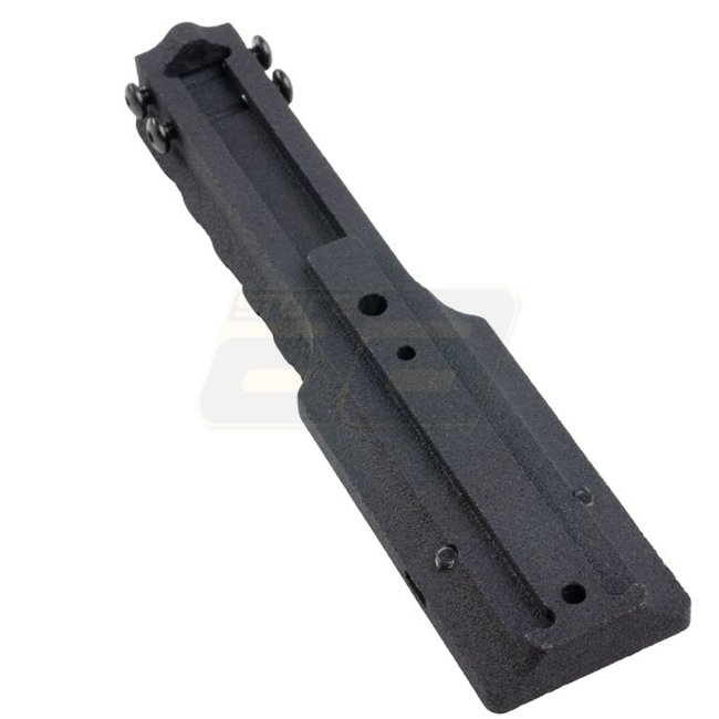 Optic Mount & Compensator Set von Revanchist Airsoft, präzise im Nylon‑Verbund mit verstärkten Schraubenaufnahmen aus Stahl gefertigt. Enthält eine obere RMR‑Platte mit 20 mm Picatinny‑Schiene und einen Compensator mit unterer Picatinny‑Befestigung.
