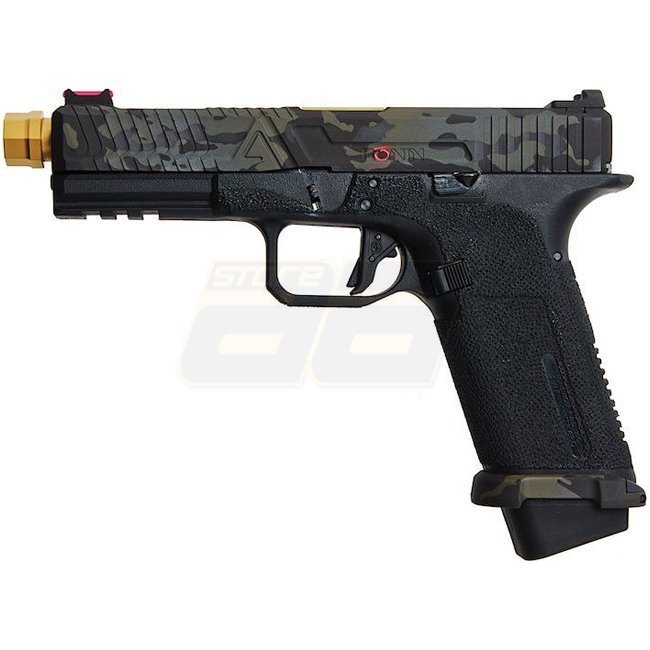 Hochwertige Agency Arms EXA Gas Blow Back Pistole Ronin Gold Barrel Edition in elegantem Schwarz. Aluminium- und faserverstärkter Polymerbau. Verfügt über ein 23-Schuss-Magazin, eine Länge von 245 mm, ein Gewicht von 680 g und ein verstellbares Hop Up. De