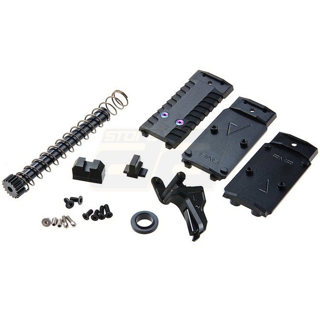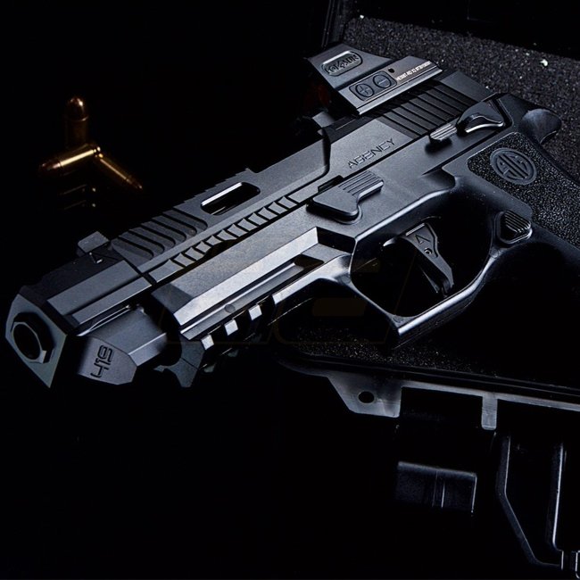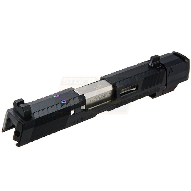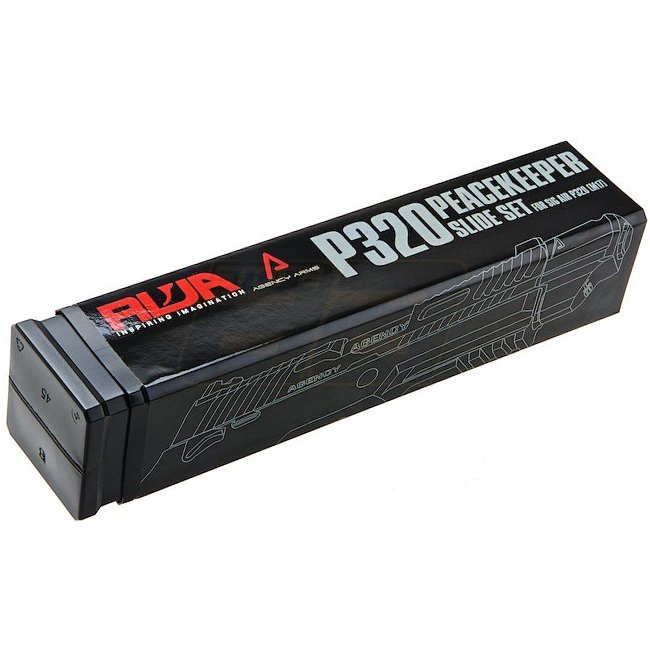 RWA Agency Arms P320 Peacekeeper Slide Set - Schwarz / Silber: CNC-aluminium Slide und Kompensator, Edelstahllauf, Agency Arms USA 3D-Dateien, SIG AIR / Proforce / VFC P320 kompatibel, RMR-Optiksystem, schwarz eloxierte Oberfläche, Stahl-Kimme und -Korn.