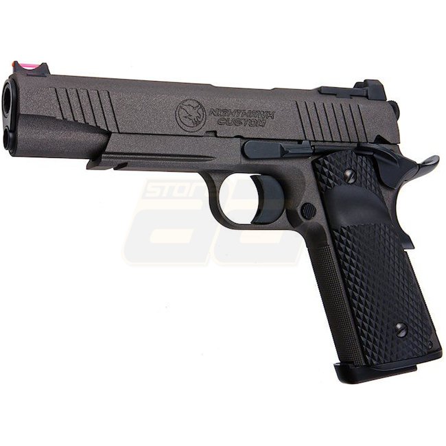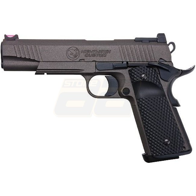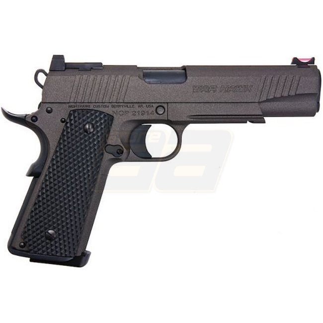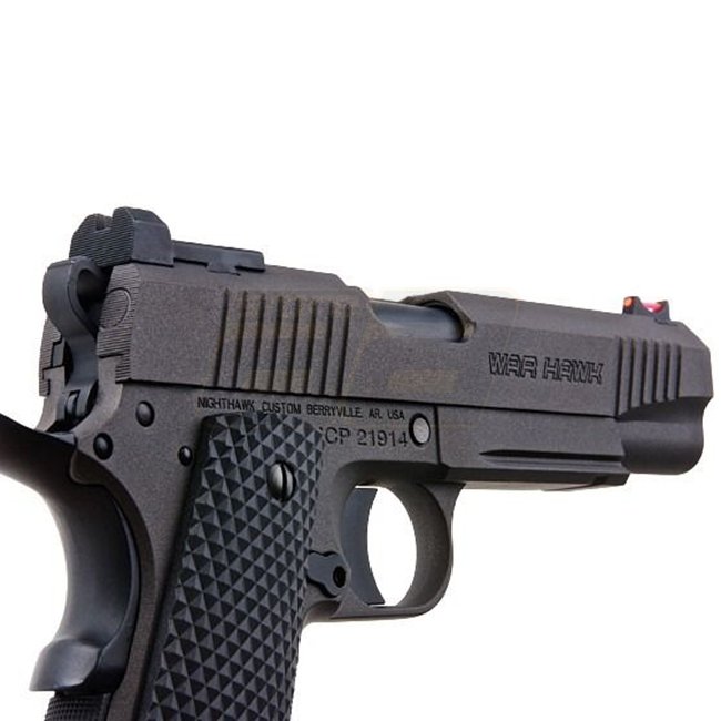 RWA Nighthawk Custom War Hawk Gas Blow Back-Pistole mit Cerakote-Oberfläche in Grau. Metallkonstruktion, 21-Schuss Magazin, 250 mm Länge, 950 g Gewicht. Mündungsgeschwindigkeit 280-300 FPS, Schussreichweite von bis zu 41 m. Semi-Auto-Schussmodus, einstell
