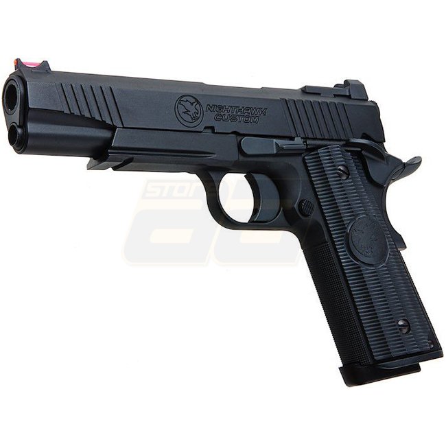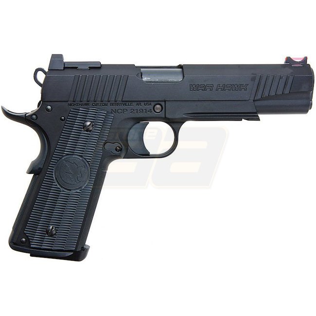 Diese RWA Nighthawk Custom War Hawk Gas Blow Back Pistole ist eine hochwertige Sonderausgabe in Schwarz. Metallkonstruktion, 21-Schuss-Magazin, 250 mm Länge, 930 g Gewicht, 280-300 FPS Geschwindigkeit, Halbautomatik-Modus und verstellbares Hop-Up. Im Lief