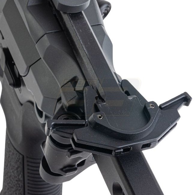 Feuerwahlhebel, Ladehebel und Magazinauslöser sind beidhändig ausgeführt. Das Gehäuse verfügt über einen erweiterten Magazinschacht und integrierte QD-Befestigungspunkte. Der klappbare Picatinny-Schaft mit gummierter Schaftkappe erhöht den Komfort, dämpft den Rückstoß und erleichtert den Transport.