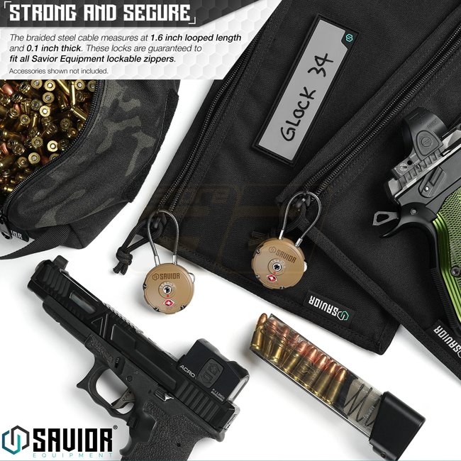 Kabelschloss mit 3-stelligem Zahlencode zur Sicherung von Taschen und harten Koffern. Von Travel Sentry® genehmigt. Gehäuse aus Zinklegierung mit 16-Gauge geflochtenem Stahlkabel. Passt zu allen verriegelbaren Reißverschlüssen von Savior Equipment. Abmess
