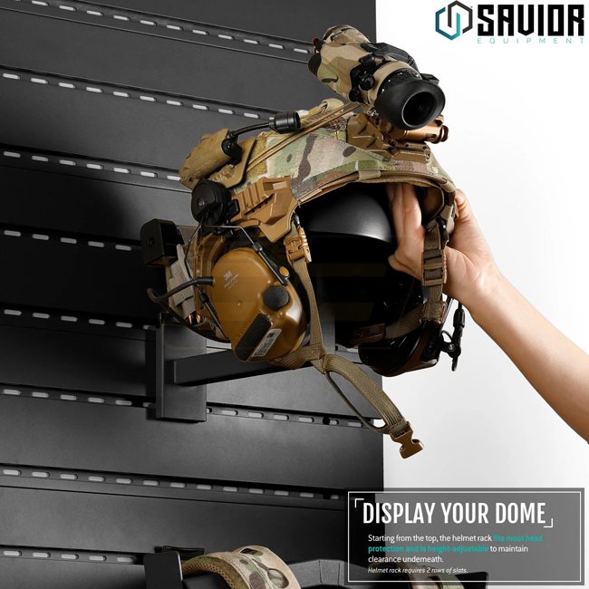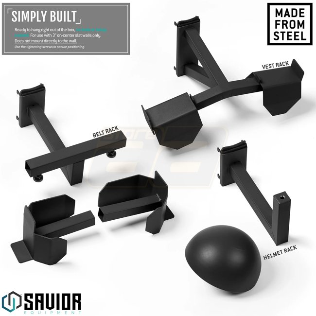Kompakter Helm-, Plattenträger- und Gürtelhalter, kompatibel mit dem Savior Equipment Wall Rack System.