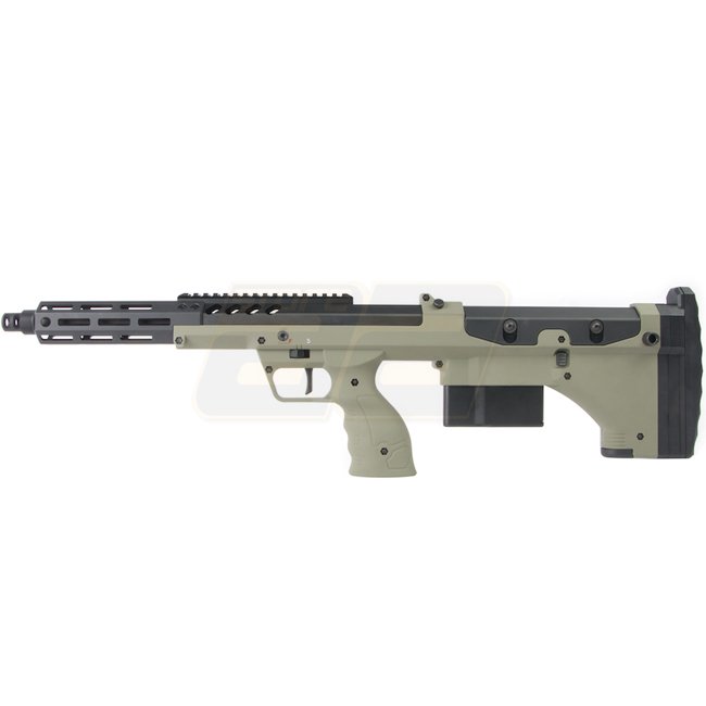 Hochwertiges Silverback Desert Tech SRS A2/M2 Covert mit 16" Lauf, perfekt für Rechtshänder. Olivenfarbe. Federsystem, Metall/Nylon Stockmaterial. Magazininhalt von 25 (6mm). Wiegt 2350g bei einer Länge von 708mm. Innenlauf Länge von 406