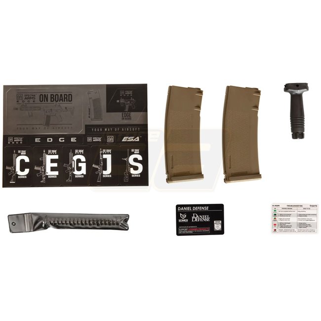Specna Arms Daniel Defense MK18 SA-E26 EDGE AEG - Chaos Bronze: Nanobeschichteter Metallkörper, ORION-Getriebe mit ESA-Schnellwechsel-System für Federn, GATE X-ASR-Mosfet, einstellbare Schussreichweite und lizenzierte Daniel Defense-Markierungen.