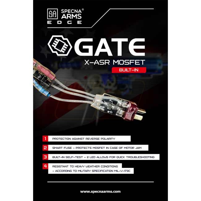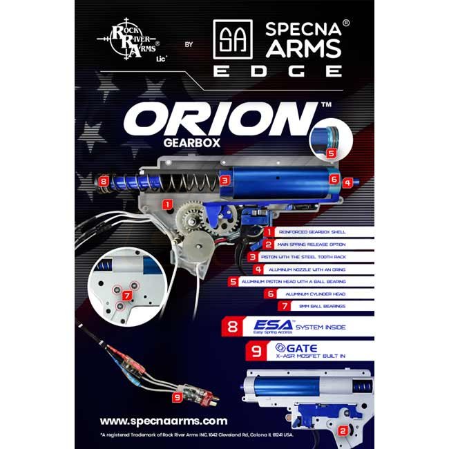 Die Modelle der Specna Arms EDGE E-Serie verfügen über ein nanobeschichtetes Metall Gehäuse. Im Innern sorgt eine robuste "ORION“ Gearbox für Zuverlässigkeit und Flexibilität, da diese mit dem "ESA“ Federschnellwechselsystem ausgestattet sind. Dadurch lässt sich die Leistung mit nur wenigen Handgriffen verändern. Des Weiteren ist die Gearbox bereits mit einem GATE X-ASR Mosfet ausgestattet. Die verbauten Teile erlauben die Verwendung unterschiedlich starker Federn (bis M140). Der 6.03mm Innenlauf kombiniert mit einer Präzisions-HopUp Unit mit umlaufendem Einstellrad sorgt für die nötige Präzision. Specna Arms liefert neben der ab Werk verbauten Feder eine zusätzliche M90 Feder mit, womit sich die Leistung der AEG auf ca. 310 FPS reduzieren lässt.