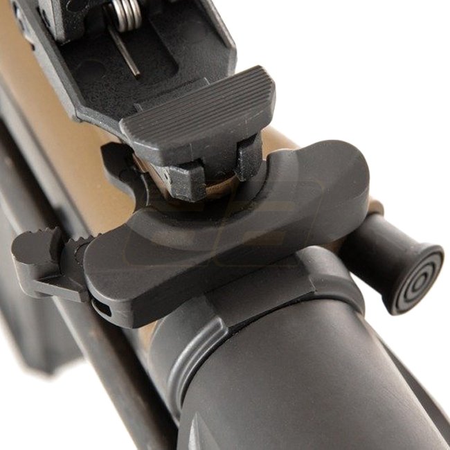 Die Modelle der Specna Arms EDGE E-Serie verfügen über ein nanobeschichtetes Metall Gehäuse. Im Innern sorgt eine robuste "ORION“ Gearbox für Zuverlässigkeit und Flexibilität, da diese mit dem "ESA“ Federschnellwechselsystem ausgestattet sind. Dadurch lässt sich die Leistung mit nur wenigen Handgriffen verändern. Des Weiteren ist die Gearbox bereits mit einem GATE X-ASR Mosfet ausgestattet. Die verbauten Teile erlauben die Verwendung unterschiedlich starker Federn (bis M140). Der 6.03mm Innenlauf kombiniert mit einer Präzisions-HopUp Unit mit umlaufendem Einstellrad sorgt für die nötige Präzision. Specna Arms liefert neben der ab Werk verbauten Feder eine zusätzliche M90 Feder mit, womit sich die Leistung der AEG auf ca. 310 FPS reduzieren lässt.