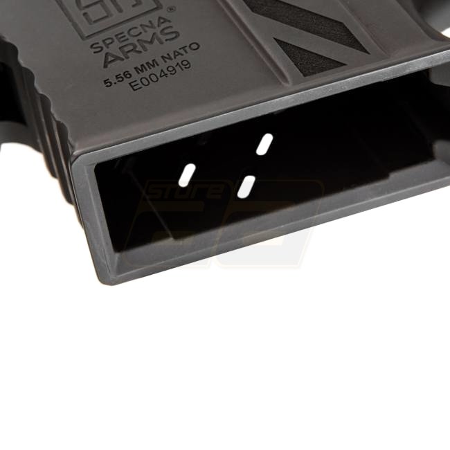 Die Modelle der Specna Arms EDGE E-Serie verfügen über ein nanobeschichtetes Metall Gehäuse. Im Innern sorgt eine robuste "ORION“ Gearbox für Zuverlässigkeit und Flexibilität, da diese mit dem "ESA“ Federschnellwechselsystem ausgestattet sind. Dadurch lässt sich die Leistung mit nur wenigen Handgriffen verändern. Des Weiteren ist die Gearbox bereits mit einem GATE X-ASR Mosfet ausgestattet. Die verbauten Teile erlauben die Verwendung unterschiedlich starker Federn (bis M140). Der 6.03mm Innenlauf kombiniert mit einer Präzisions-HopUp Unit mit umlaufendem Einstellrad sorgt für die nötige Präzision. Specna Arms liefert neben der ab Werk verbauten Feder eine zusätzliche M90 Feder mit, womit sich die Leistung der AEG auf ca. 310 FPS reduzieren lässt.