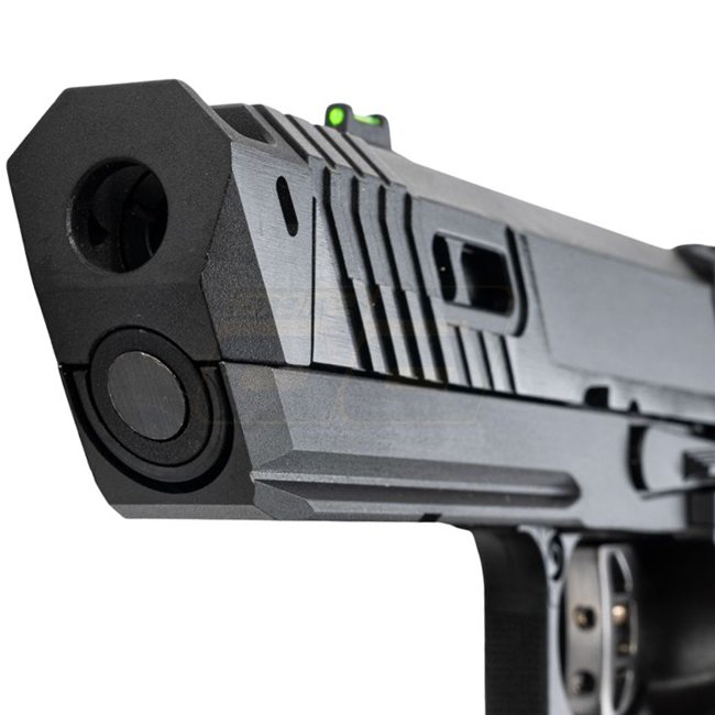 Die strukturierte Polymergriffunterlage sorgt für sicheren Halt, während das vergrößerte Magwell zügiges Nachladen erlaubt. Der mitgelieferte Kompensator und die RMR-Aufnahme verstärken den taktischen Anspruch und Präzisionsgewinn.