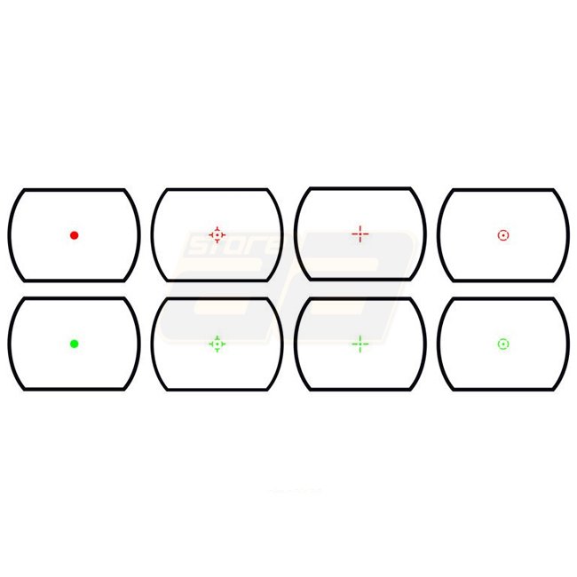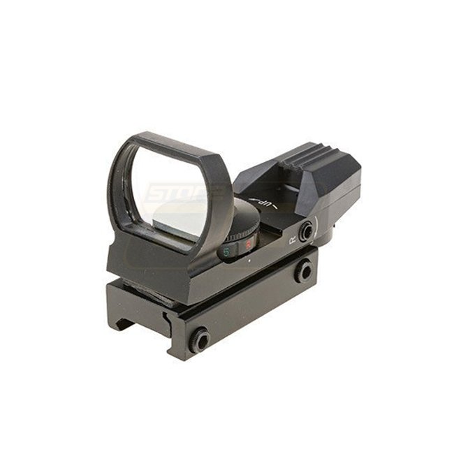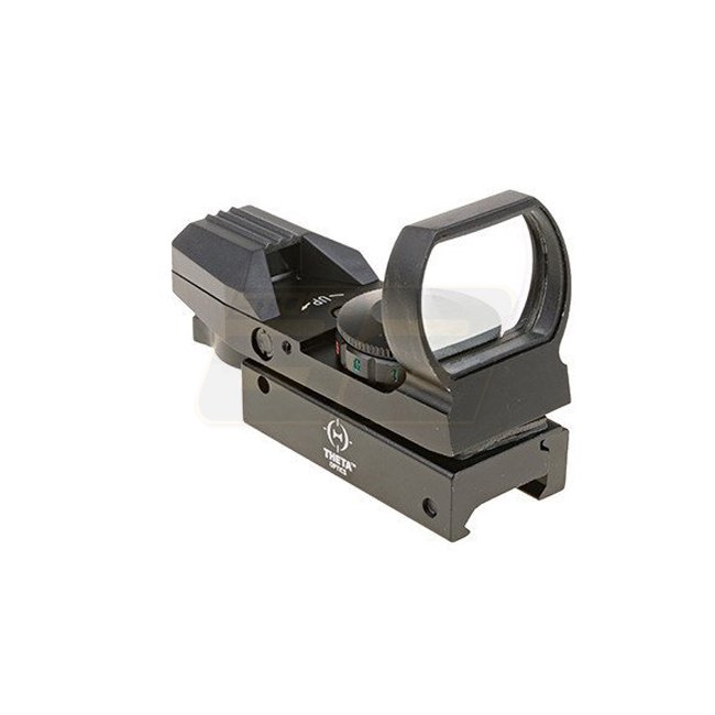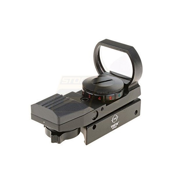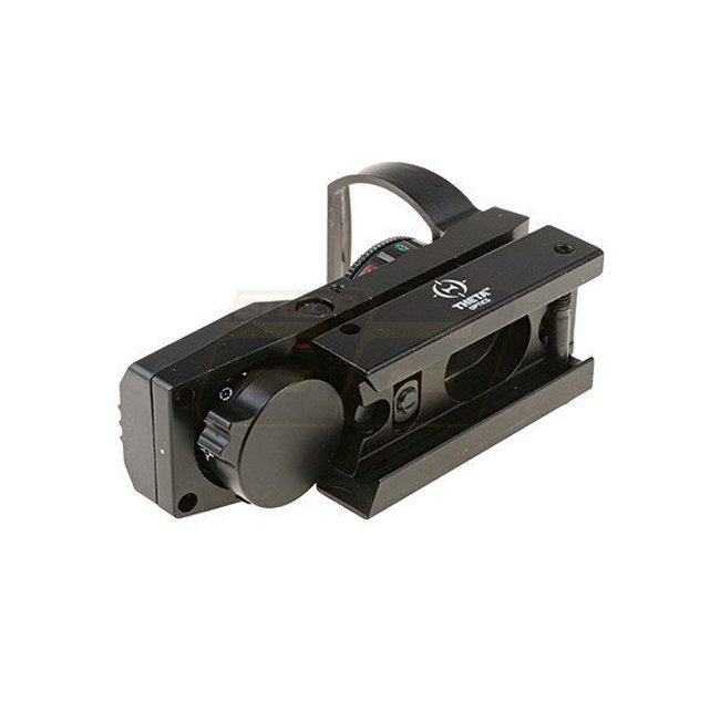 Theta Optics Offene Reflexvisierung Replica - Schwarz: 1x Vergrößerung, 35mm Objektiv, rote und grüne Beleuchtung. Absehen: Punkt & Kreis. Einstellbare Wind- und Höhenverstellung. Verwendet 1x CR2032 Batterie. 20mm (Picatinny) Montage. Länge: 82mm.