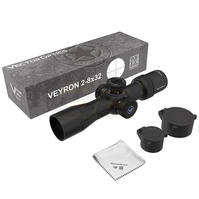 Dieses Vector Optics Veyron 2-8x32IR Kompakt-Zielfernrohr verfügt über 2-8x Vergrößerung, 32mm Objektivlinse, 17-4m Sichtfeld, MPR-V5 Absehen, 1/10 MIL Justierung, 23,5 MIL maximale Höhen- und Seitenverstellung, rot beleuchtetes Absehen und 6061-T6 Alumin