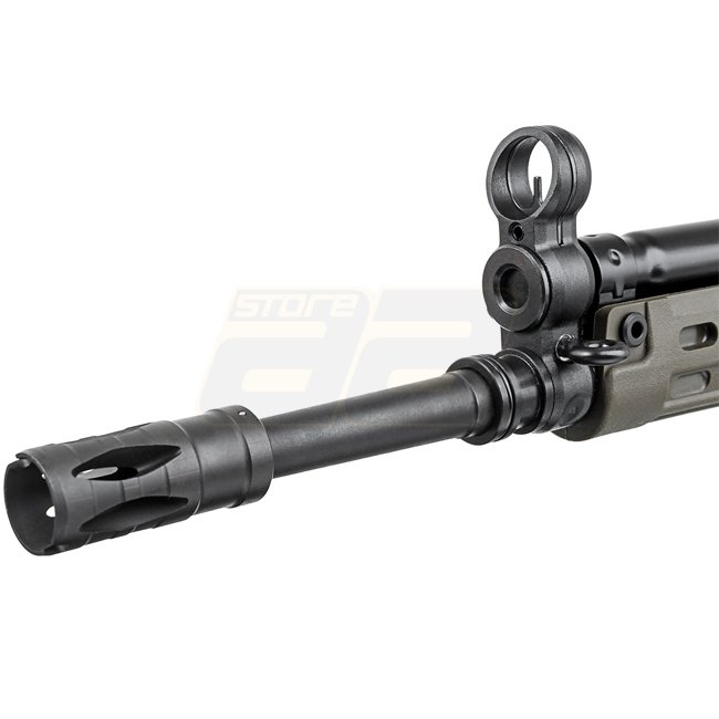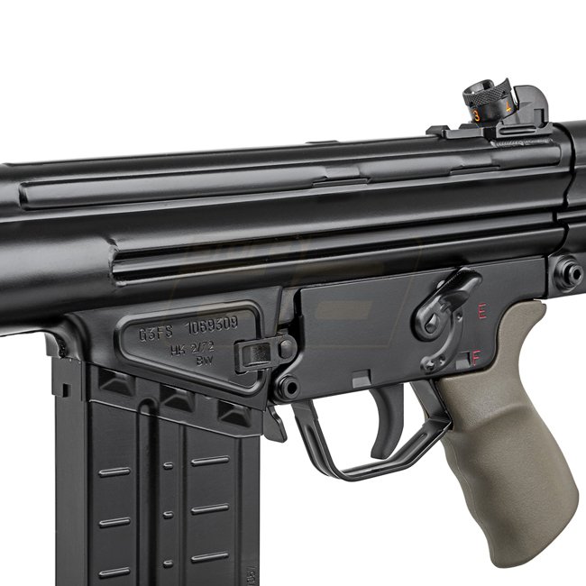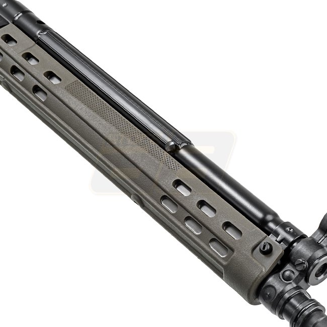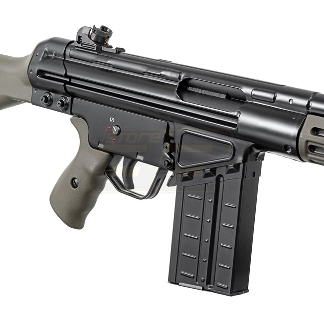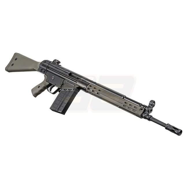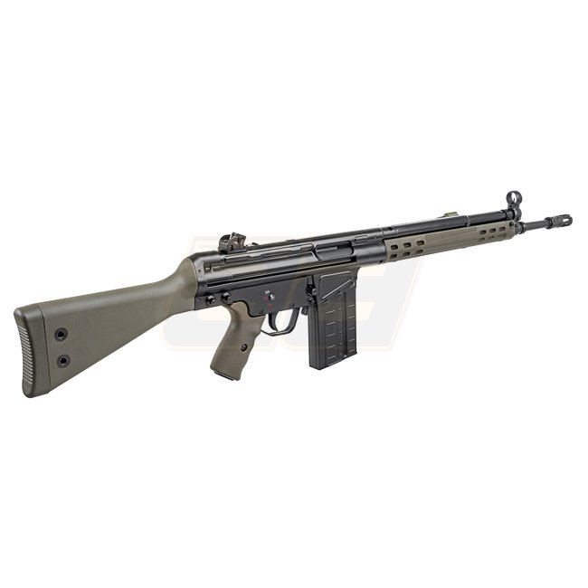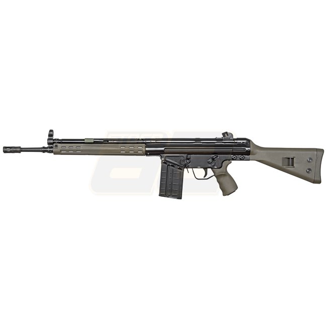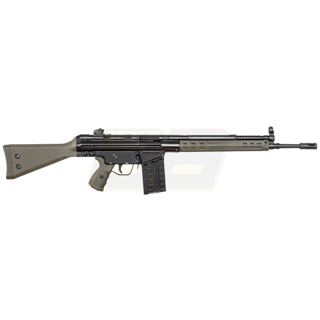 VFC G3A3 Gas Blow Back Gewehr - Oliv. Aluminiumlegierung / Stahl / Faserverstärkter Polymer. 20 (6mm) Magazin Kapazität. 815-875mm Länge. 3270g Gewicht. 455mm Innenlauf Länge. Mündungsgewinde: / Mündungsenergie: 420-440 FPS / 1.64-1.80 Joule. Halbautomati
