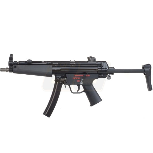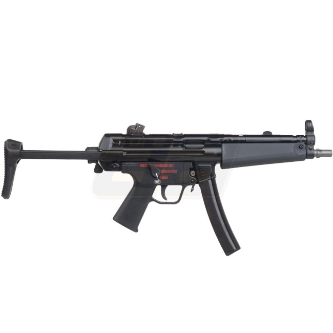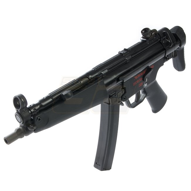 Hochwertiges VFC MP5A5 Gas Blow Back Gewehr mit originalen H&K Markierungen, Metallkonstruktion und verstellbarem Hop-Up. 30 Schuss Magazin, Schussreichweite von 45-48m und Halbautomatik- & Vollautomatik-Modi.