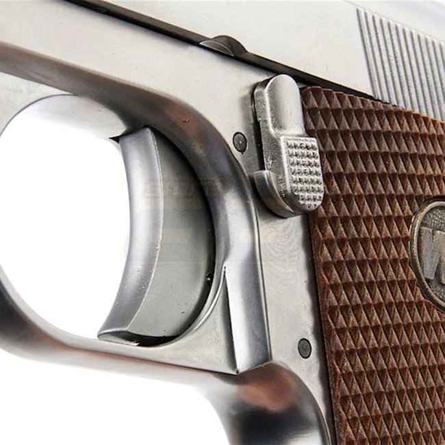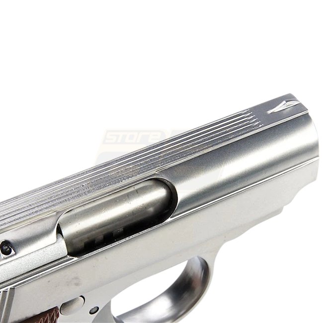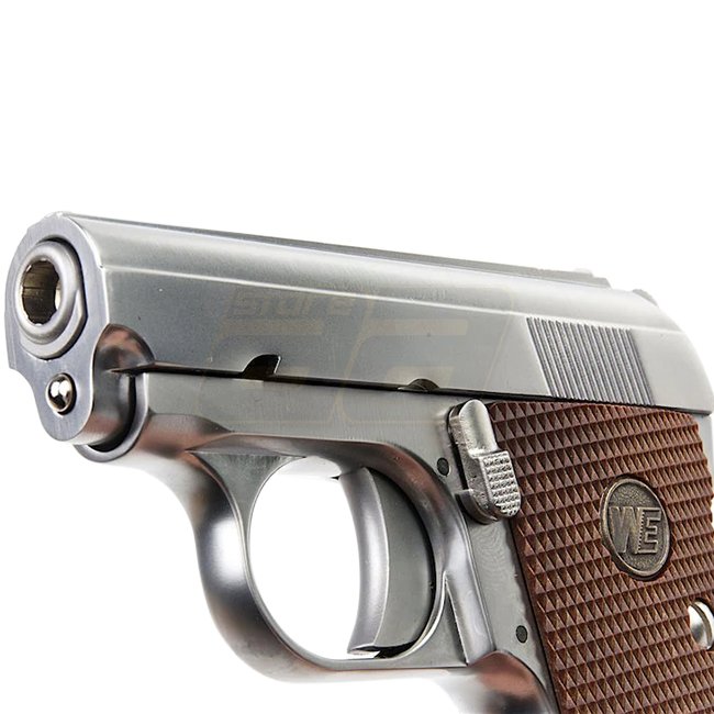 Eine hochqualitative WE CT25 Gas Blowback Pistole mit silberner Oberfläche. Metall- und Polymerkonstruktion, halbautomatischer Schuss mit einstellbarem Hop-Up. Leicht mit 308g, mit einer Magazin Kapazität von 7, einer Reichweite von 27,44-30,18m und einer