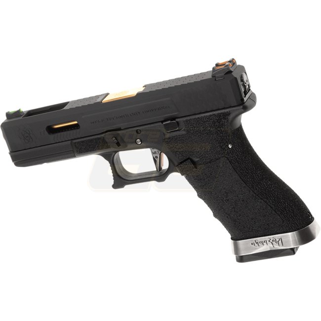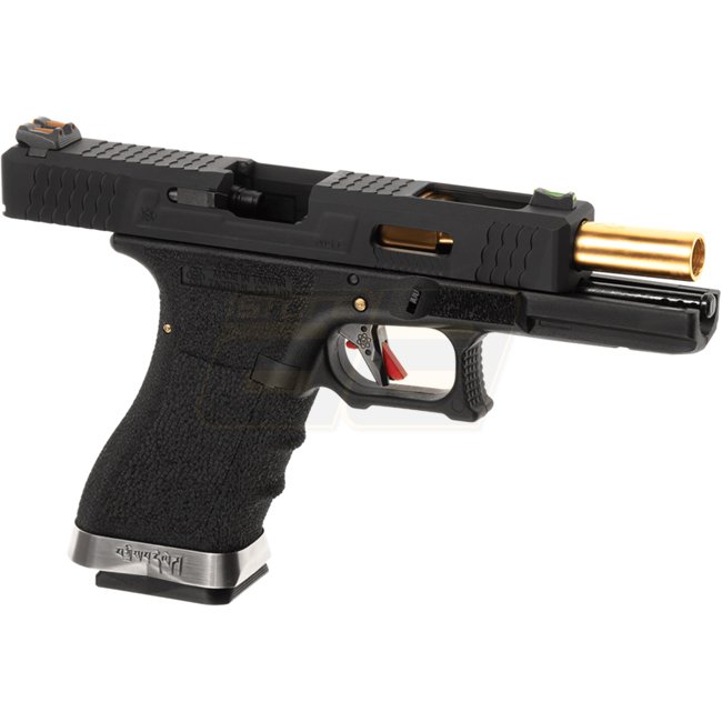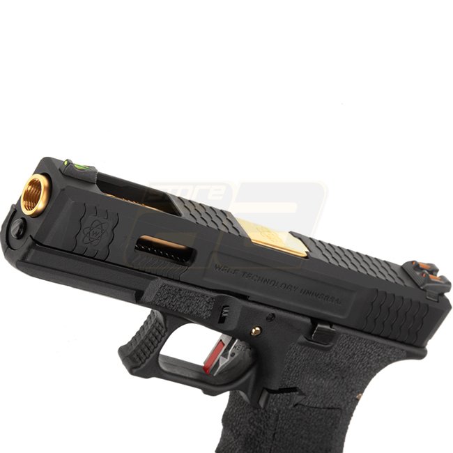 WE G-Force 17 BK Gold Barrel Gas Blow Back Pistole - Schwarz. Metall-/Polymerkonstruktion, Magazin kapazität von 26 (6mm) Rund. Merkmale: 205 mm Länge, wiegt 820 g. Ausgestattet mit einem 95 mm Innenlauf, mit einer Mündungsgeschwindigkeit von 320-340 FPS