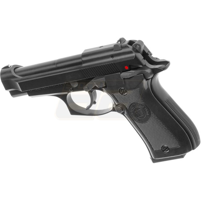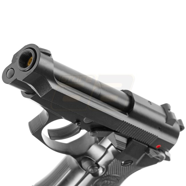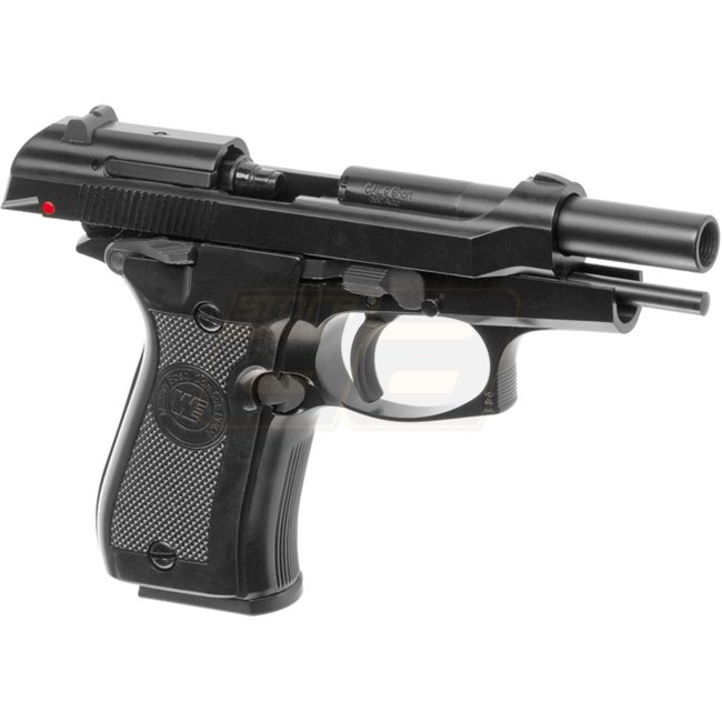 Die WE M84 Gas Blow Back Pistole - Schwarz ist eine hochwertige Airsoft-Waffe aus Metall und Polymer. Sie hat eine Magazin Kapazität von 17 Schuss, eine Länge von 175 mm und wiegt 620 g. Mit einer Innenlauflänge von 75 mm bietet sie eine Mündungsgeschwind