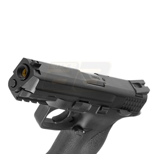 Wir M&P Full Auto Gas Blow Back Pistole - Schwarz: Metall/Polymer, 22-Schuss-Kapazität, 195mm Länge, 710g Gewicht, 90mm Innenlauf, 290-310 FPS, Halb- und Vollautomatik, Reichweite 39,79-42,53m, Einstellbares Hop Up. Enthält Waffe und Magazin.