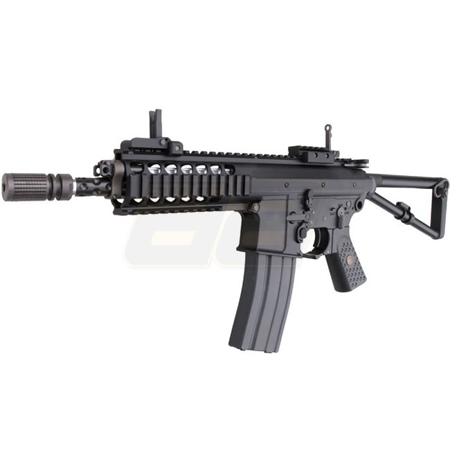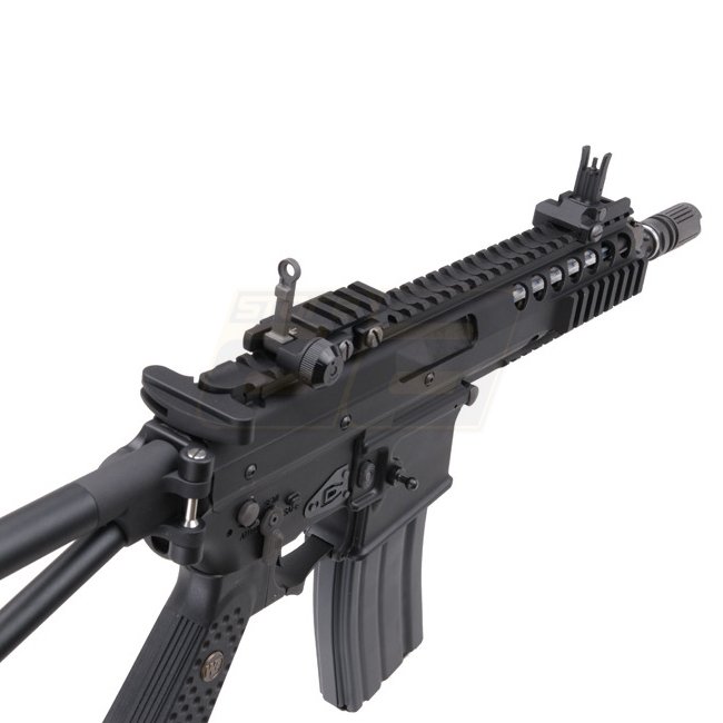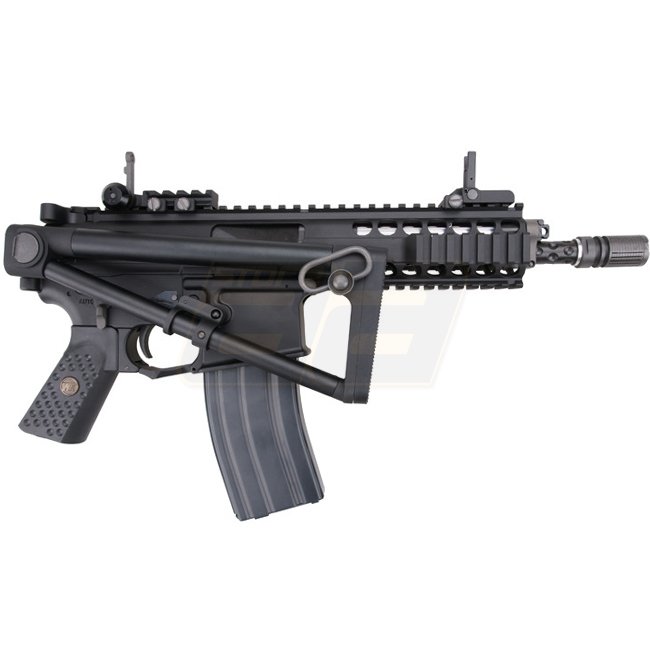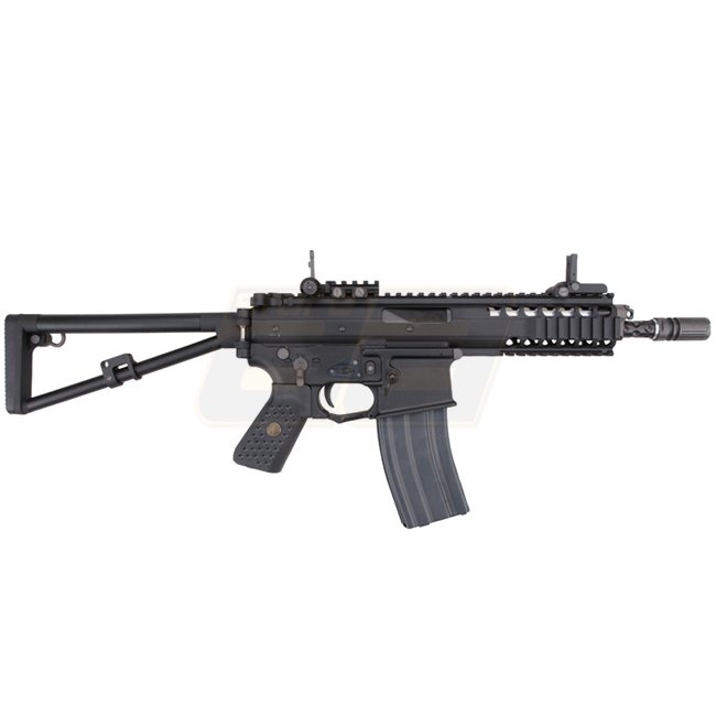 Die KAC PDW (Personal Defense Weapon) von WE erreicht in der Version mit verkürztem Aussenlauf gerade mal eine Länge von 43,5cm beziehungsweise 66,7cm bei ausgeklapptem Schaft bei nicht einmal zwei ein halb Kilo. Mit dem neuen Open Bolt System kann WE einen wichtigen Schritt in Richtung Authentizität machen: In den älteren WE Modellen war bei geöffnetem Verschluss jeweils ein Messingrohr ersichtlich, was optisch nicht zu den sonst sehr realistischen Waffen passte. Das Resultat ist eine rundum zufriedenstellendes Gas Blow Back Rifle wie man es sich von WE gewohnt ist – inklusive realistischem Verschluss und starkem Rückstoss.
