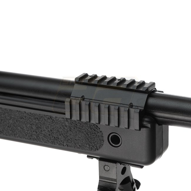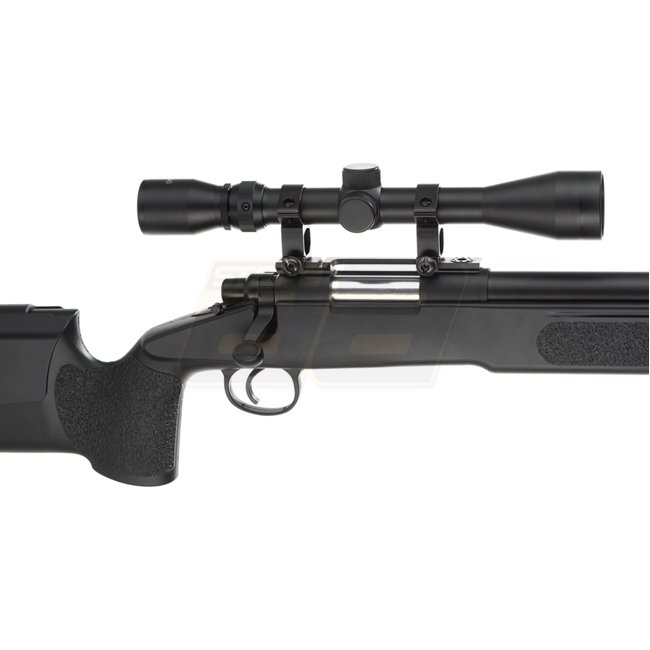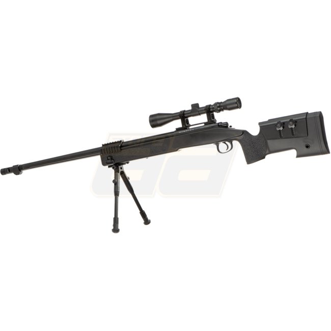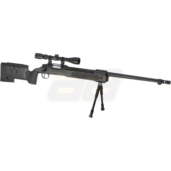 Hochwertiges WELL MB16 Spring Sniper Rifle Set in schwarzer Farbe. Metall- und Polymerkonstruktion mit einer MagazinKapazität von 20 Schuss. Verfügt über ein einstellbares Hop-Up, einen Einzelschuss-Modus und eine beeindruckende Reichweite von bis zu 79,5