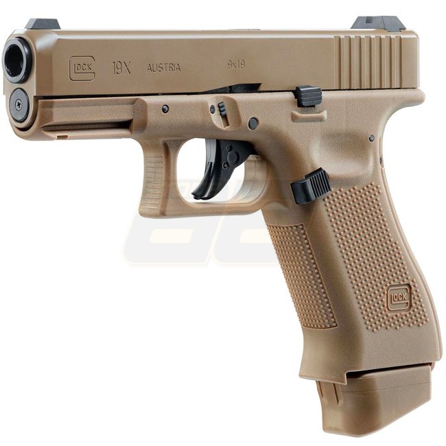 Hochwertige WinGun Glock 19X Co2 Blow Back Pistole mit Metall-Schlitten und Kunststoffgriff & -rahmen. Halbautomatischer Schießmodus, 14-Schuss Magazin Kapazität und Mündungsgeschwindigkeit von 360-380 FPS. Perfekt für Airsoft-Enthusiasten.