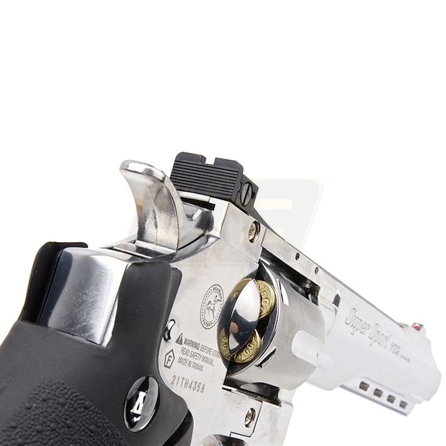 Eine realistische Airsoft-Revolver-Nachbildung, der WinGun Co2 702, verfügt über einen 6-Zoll-Lauf und einen schwarzen Griff mit einer silbernen Oberfläche. Er bietet eine Magazin Kapazität von 6 (6mm) Patronen und schießt mit einer Geschwindigkeit von 37