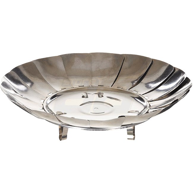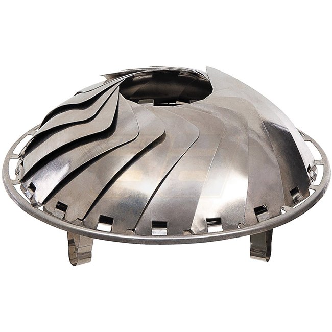 Safe and tidy fireplace 17 movable blades for opening of the bowl chimney effect due to small hole in the bottom plate, 1 opening ca. 1 x 0,5 cm per blade and 3 detachable feet for a ground distance of ca. 3,5 cm fire starters, etc. stowable inside Pack size: ca. 17 x 4,5 cm Dimensions with feet: open: ca. 27 x 8 cm closed: ca. 17 x 8 cm Weight: ca. 205 g
