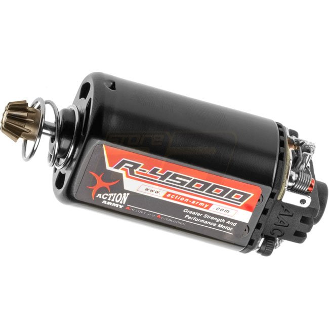 Moteur Infinity Action Army 45000R. Moteur à court axe puissant et de haute qualité conçu pour des performances maximales. Idéal pour les passionnés d'airsoft à la recherche d'une mise à niveau de premier ordre. Découvrez une vitesse et une précision inég