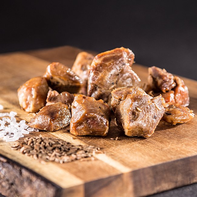 Vous n'avez pas besoin d'extras, vous n'avez pas besoin de ballast supplémentaire inutile. Vous n'avez besoin que de la viande ! Morceaux d'épaule de porc cuits à la vapeur et cuits à la vapeur au cumin. En raison de sa teneur plus élevée en matières grasses, la viande est juteuse et savoureuse, et même après avoir perdu un tiers de son poids au cours du processus de cuisson, elle n'est ni sèche ni filandreuse. Son faible poids et sa haute valeur nutritionnelle en font la solution idéale pour les randonnées, les voyages à vélo et à peu près partout où vous voyagez léger.