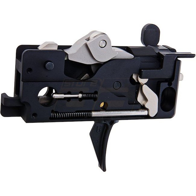 Le fonctionnement interne du groupe de déclenchement est en acier inoxydable, les pièces incluses dans l'ensemble (levier de sécurité, loquet magnétique, déverrouillage du boulon, plaque d'arrêt du boulon, vis et goupille) sont en acier.