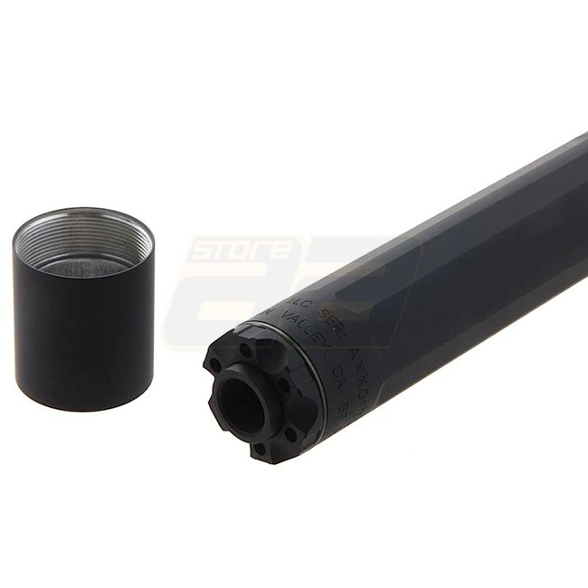 Ce suppresseur factice a une finition Cerakote, ce qui signifie que la finition est beaucoup plus résistante aux rayures et à l'usure. Le filetage de cette unité est également modulaire car il s'adapte aux canons filetés de 14mm CCW et de 16mm CW.