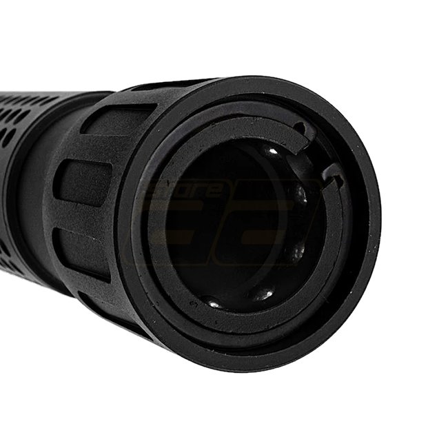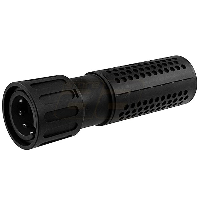 Le silencieux Ares M110K est un silencieux factice pour les AEG ARES SOC-AR, SR-011 et SR-012. Le silencieux est conçu pour s'adapter directement sur le cache-flamme desdits modèles grâce à un système QD. Soulevez simplement le mécanisme de verrouillage inférieur, placez-le sur le cache-flash et relâchez.