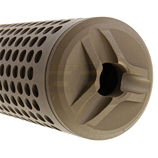 Silencieux long Ares SR-16 en Terre Sombre pour un look élégant et tactique. Se fixe facilement sur le cache-flamme avec un support QD. Longueur : 175 mm. Diamètre : 38 mm.