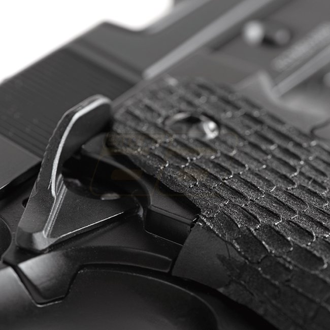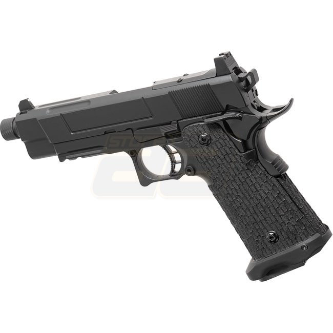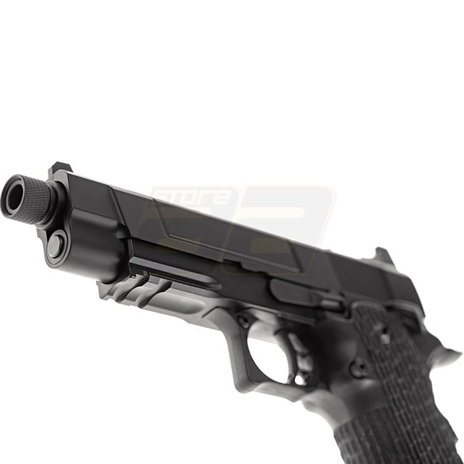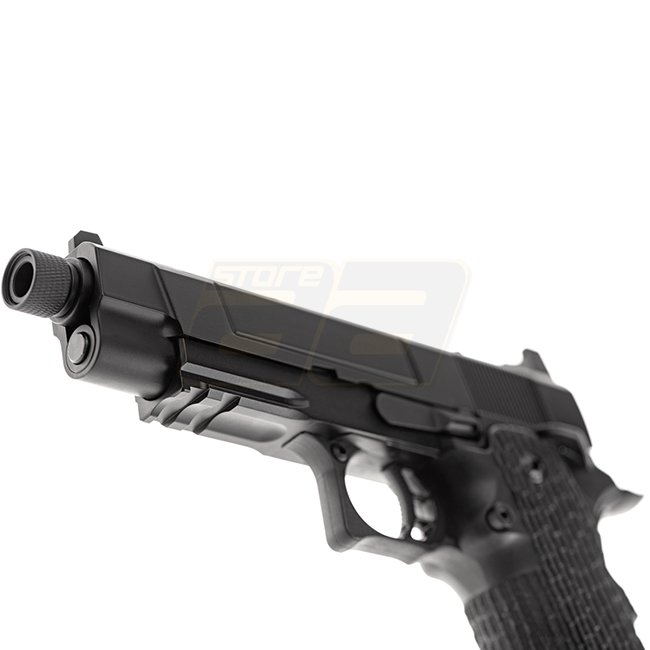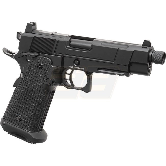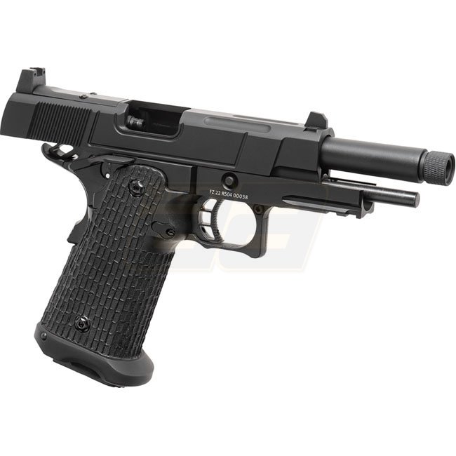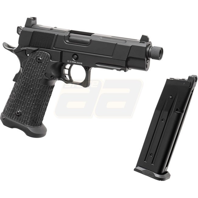 Pistolet à gaz à recul Authentic Army Armament R504 au design noir élégant. Construction en métal et en polymère, capacité du chargeur de 28 billes, longueur de 216mm, poids de 920g, longueur du canon intérieur de 100mm, tir à 290-310 FPS, mode de tir sem