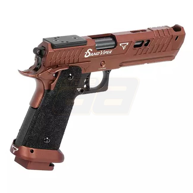 Pistolet à gaz Blowback de couleur Sand Viper avec une capacité de 28 coups. Fabriqué en polymère de haute qualité avec des pièces métalliques. Dispose d'une glissière