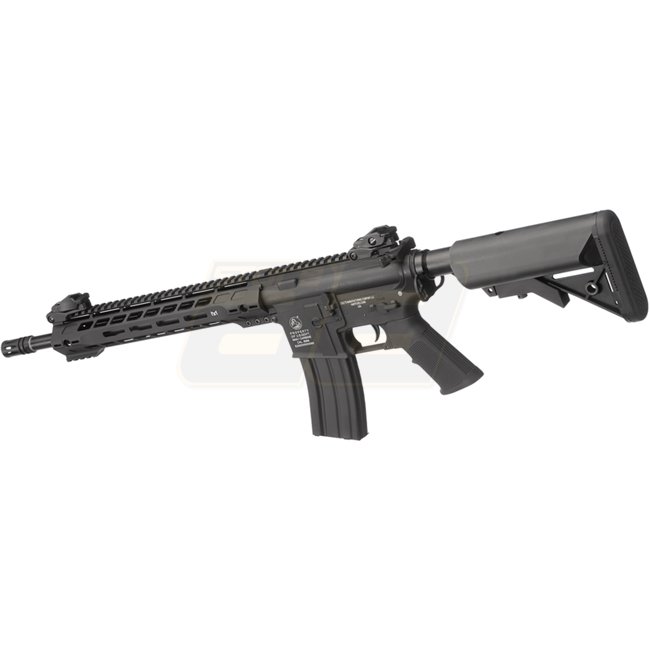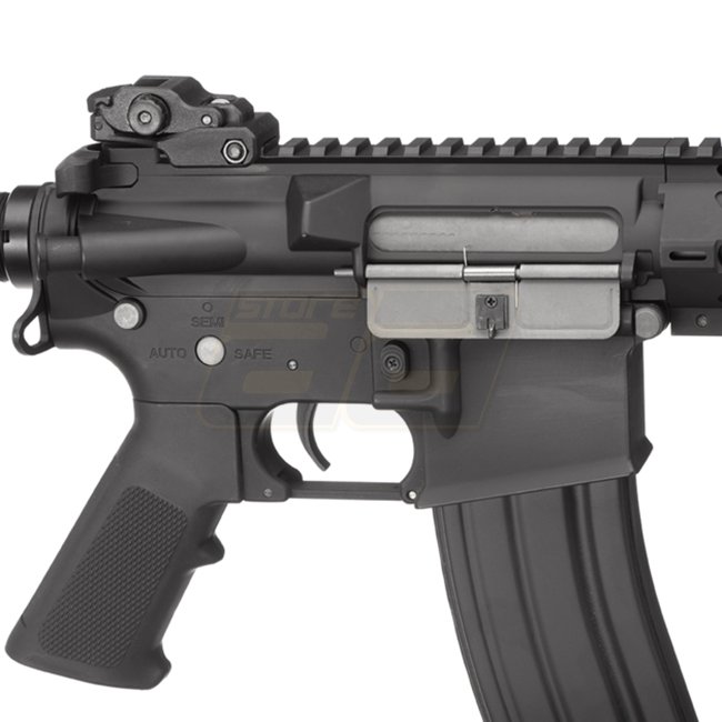 AEG Colt M4 Hawkeye de haute qualité en noir élégant. Les caractéristiques incluent un boîtier Version 2, MOSFET, moteur long, construction en métal avec crosse et poignée en polymère, chargeur de 300 billes, hop-up réglable, portée de tir de 45,27 à 48,0