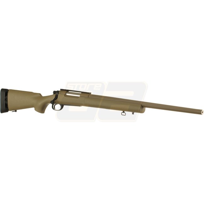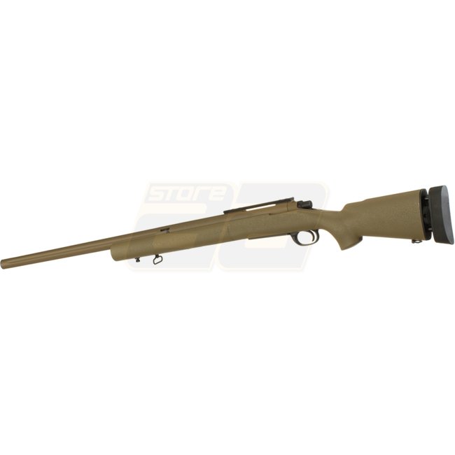 Fusil de tireur d'élite Cyma M24 SWS CM702 à ressort - Tan avec crosse en métal/polymer. 1100 mm de longueur et 2800 g de poids. Tire à 500-520 FPS avec hop-up réglable. Idéal pour une action précise et en tir unique.