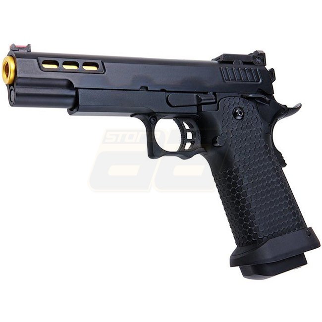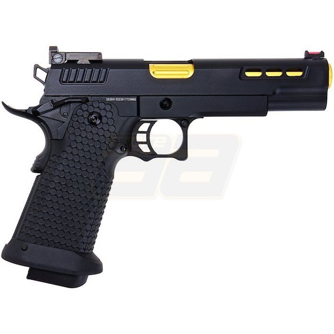 Pistolet à gaz Golden Eagle Hi-Capa 5.1 de haute qualité avec glissière en aluminium CNC. Construction métal/polymer, magasin de 30 coups, longueur de 250 mm, poids de 1101 g. Comprend un canon interne de 100 mm, une vitesse de bouche de 300-320 FPS, un m
