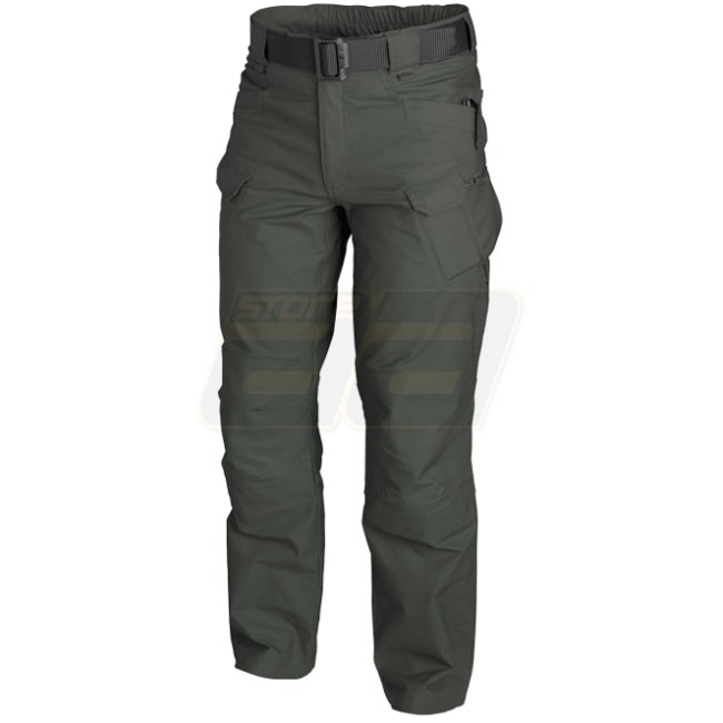 Pantalons tactiques urbains Helikon-Tex en vert jungle, 4XL très long. Fabriqués avec 60% de coton, 37% de polyester, 3% d'élasthanne. Caractéristiques : taille élastique, grandes passants de ceinture, poches renforcées et compatibilité avec des protectio