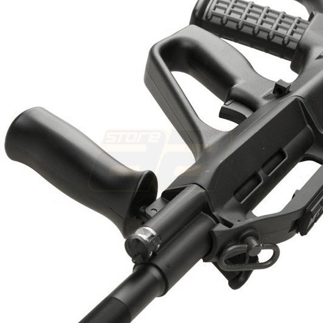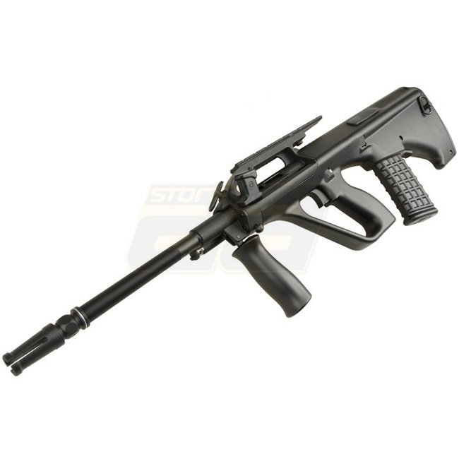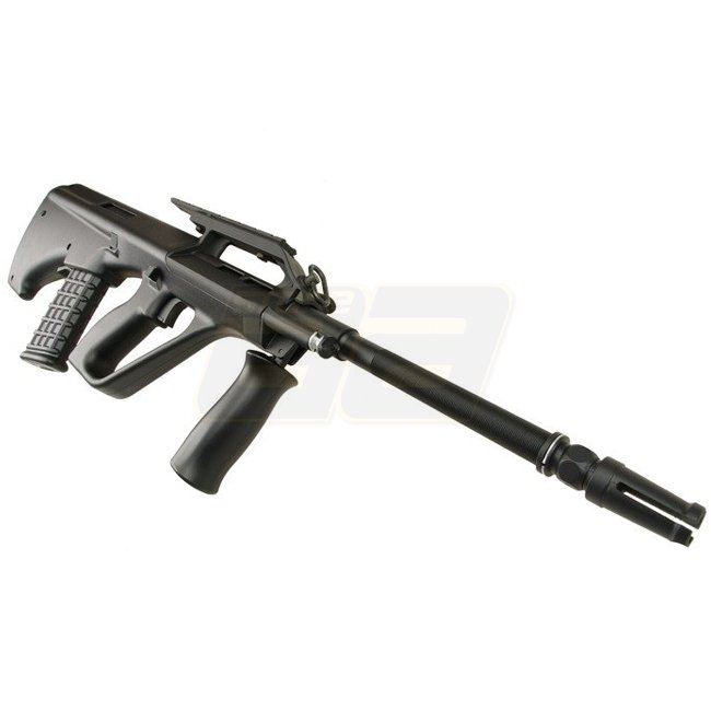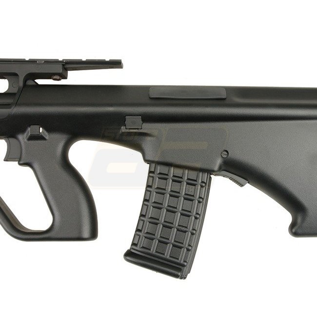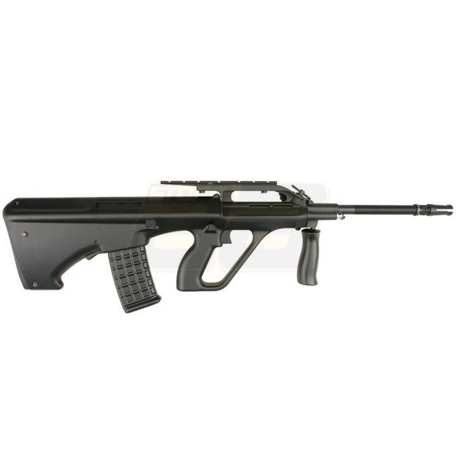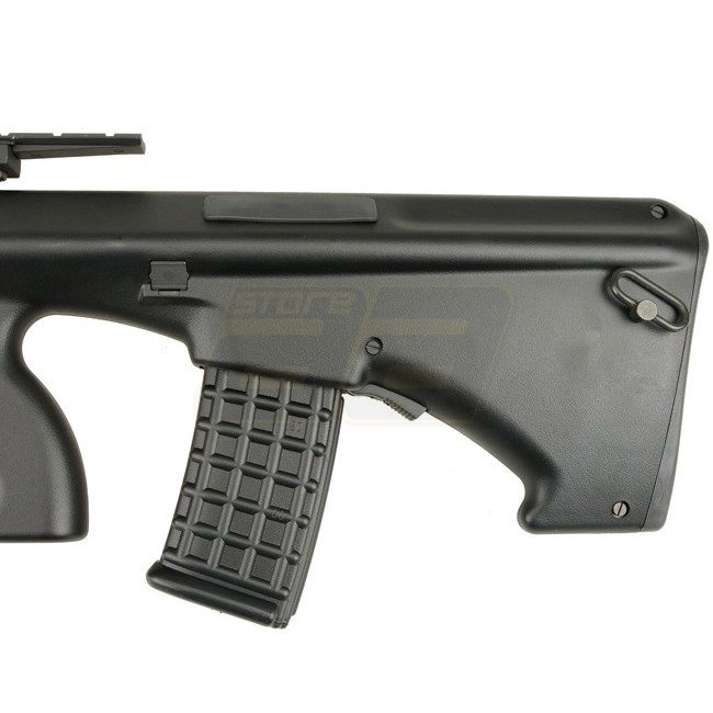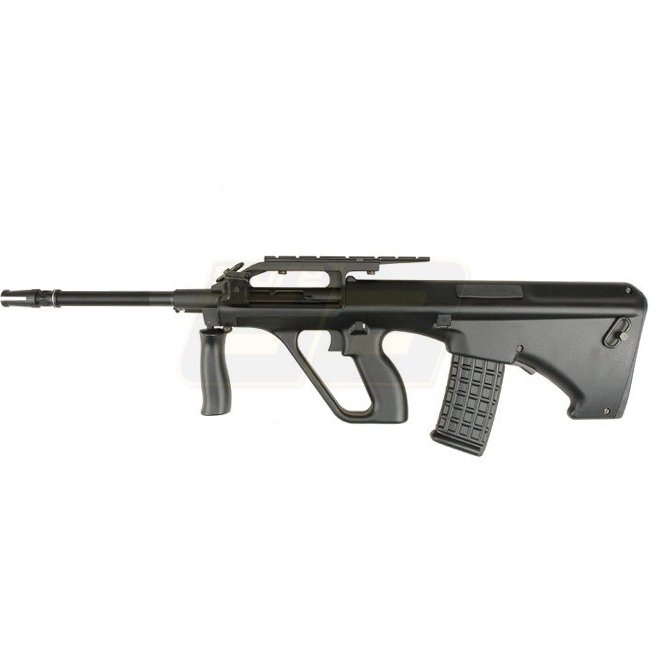 Jing Gong AUG AEG avec boîte de vitesses en métal, capacité de magazine de 300 billes, mode de tir Semi-Automatique et hop-up réglable. Forfait complet avec arme, magazine, batterie et chargeur.