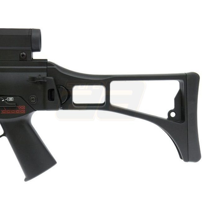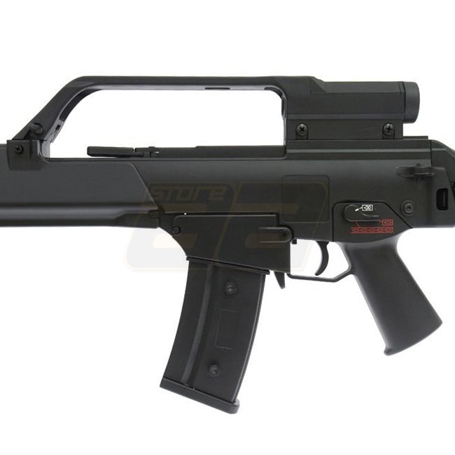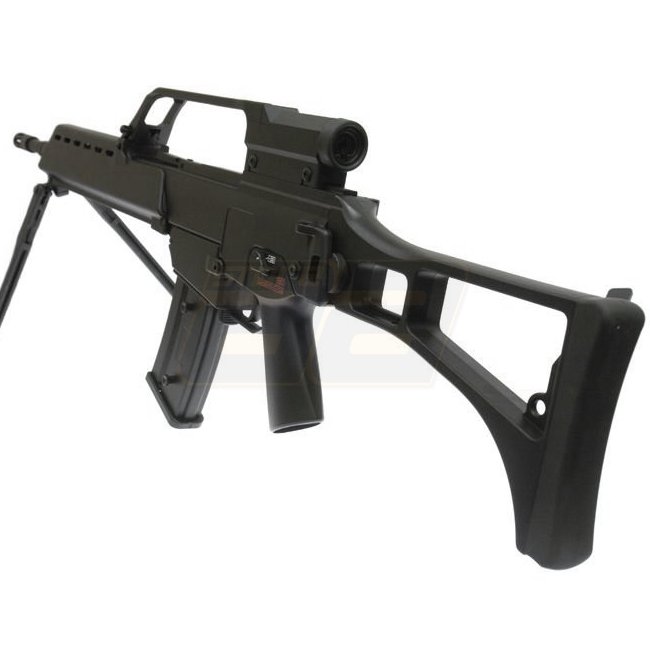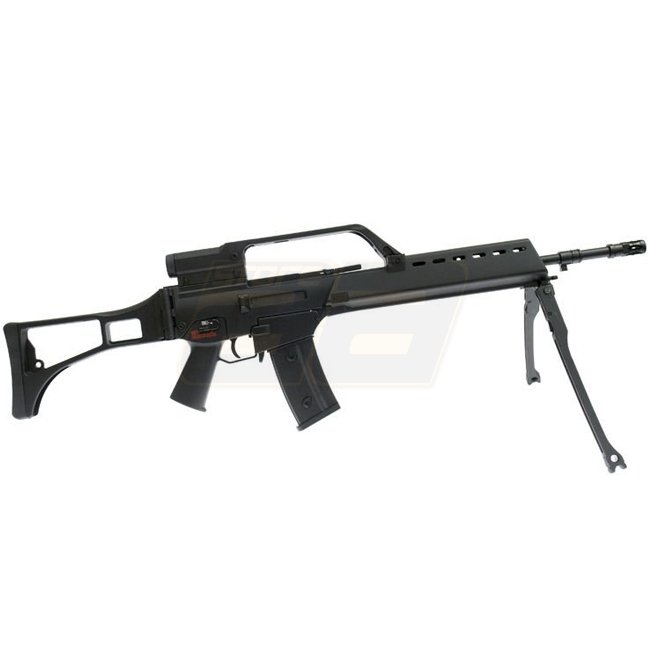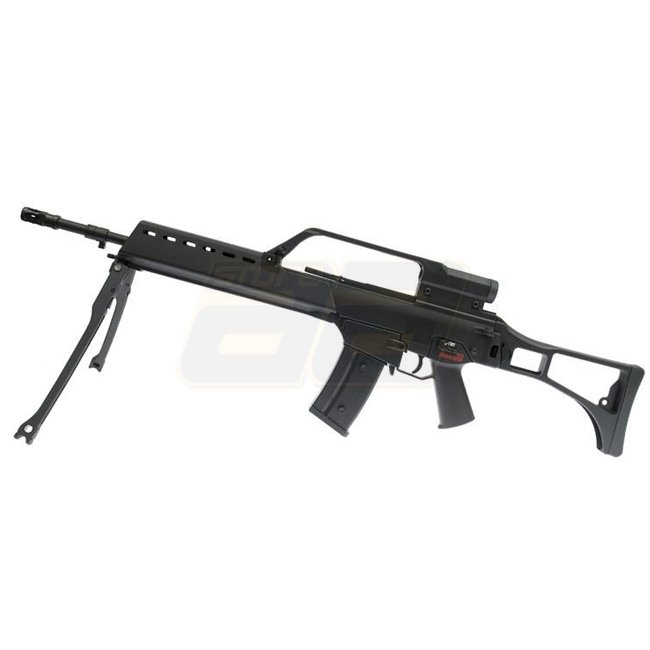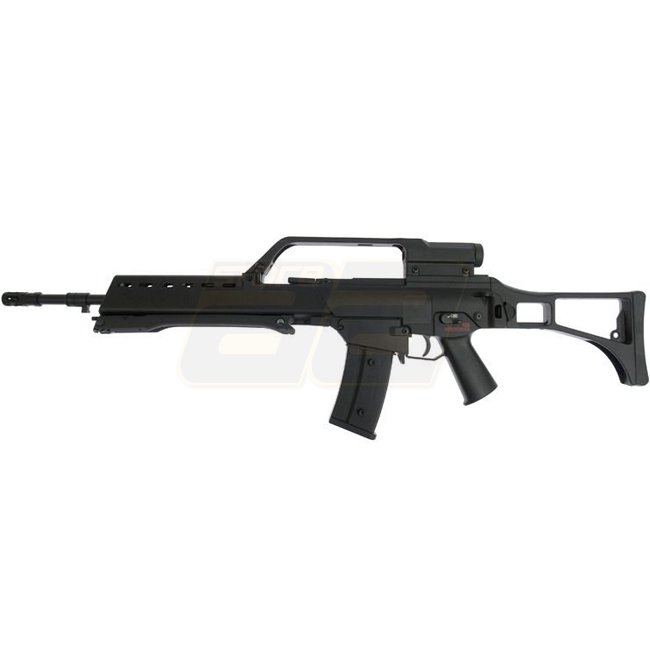 Fusil AEG Jing Gong JG36E - Noir : Puissant fusil AEG avec une vélocité de 360-380 FPS, hop-up réglable, et modes semi-automatique et automatique. Livré avec un gearbox de version 3, en plastique ABS, capacité de chargeur de 470 billes, et une longueur de