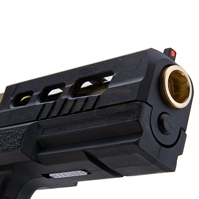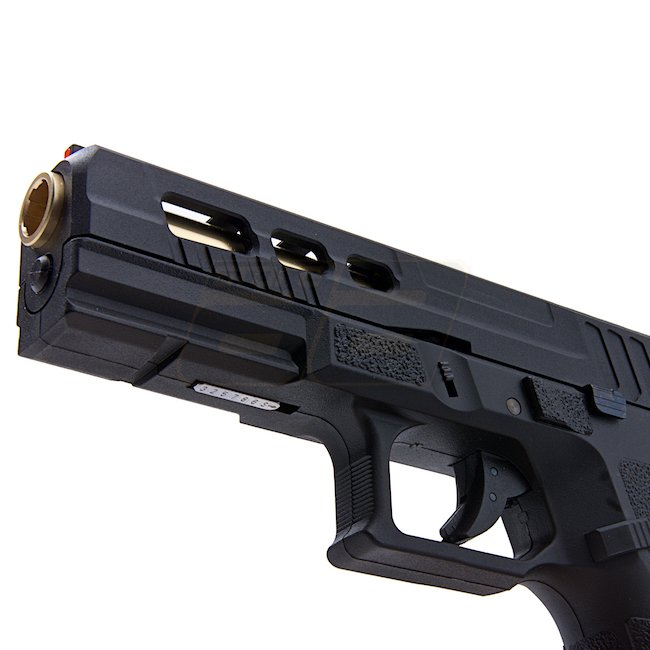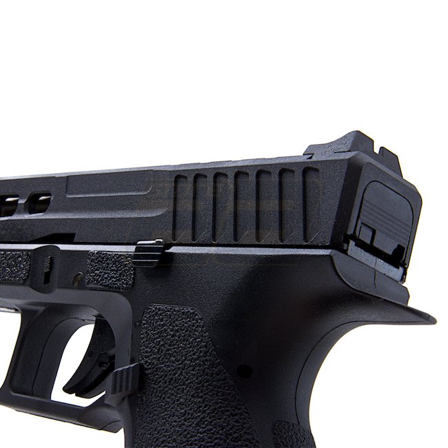 Pistolet à gaz KJ Works KP-13 C Blow Back - Noir : Glissière en métal / poignée et cadre en plastique, capacité de chargeur de 25 (6 mm), longueur de 201 mm, poids de 760 g, longueur du canon intérieur de 95 mm, vitesse à la bouche de 310-330 FPS, mode de