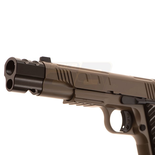Ce pistolet KJ Works KP-16 à gaz Blow Back en Tan est un choix fiable pour les passionnés d'airsoft. Il dispose d'une construction en métal/polymer avec une capacité de chargeur de 26 billes. Le pistolet a une longueur de 255 mm et pèse 990 g. Avec une lo