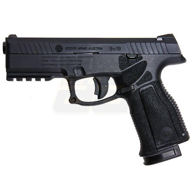 Pistolet à gaz soufflant KJ Works STEYR L9A2 - Noir. Glissière en métal avec poignée et cadre en plastique, capacité de magasin de 22 cartouches, longueur de 200 mm, poids de 850 g, longueur du canon interne de 103 mm, vitesse de bouche de 300-320 FPS, mo