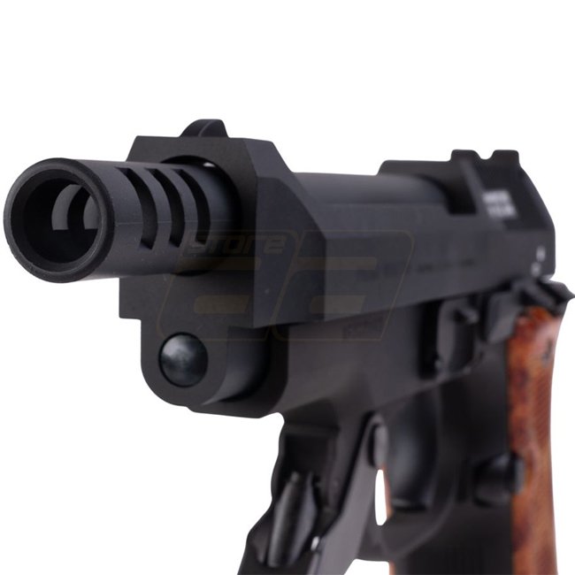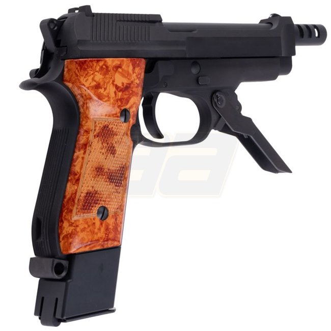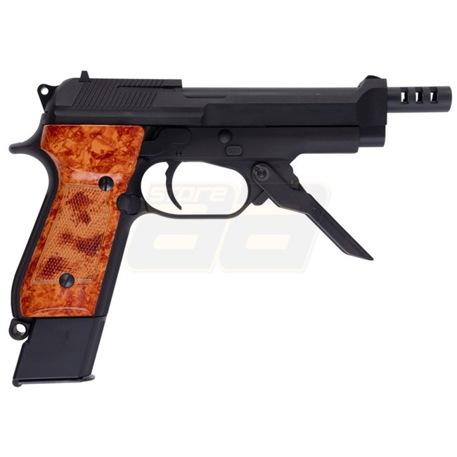 Le modèle est doté d'un corps Heavy Weight (HW) avec des renforts métalliques, conférant à l'arme un poids réaliste et une sensation de haute qualité. Les caractéristiques typiques du M93R sont entièrement conservées : mode rafale de trois coups, tir semi-automatique et poignée avant repliable pour un meilleur contrôle lors des tirs rapides.
